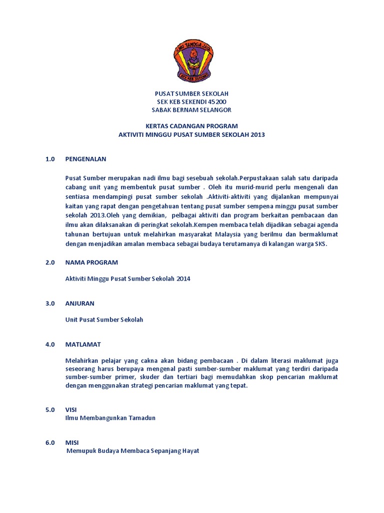 Kertas Cadangan Program Aktiviti Minggu Pusat Sumber Sekolah 2013