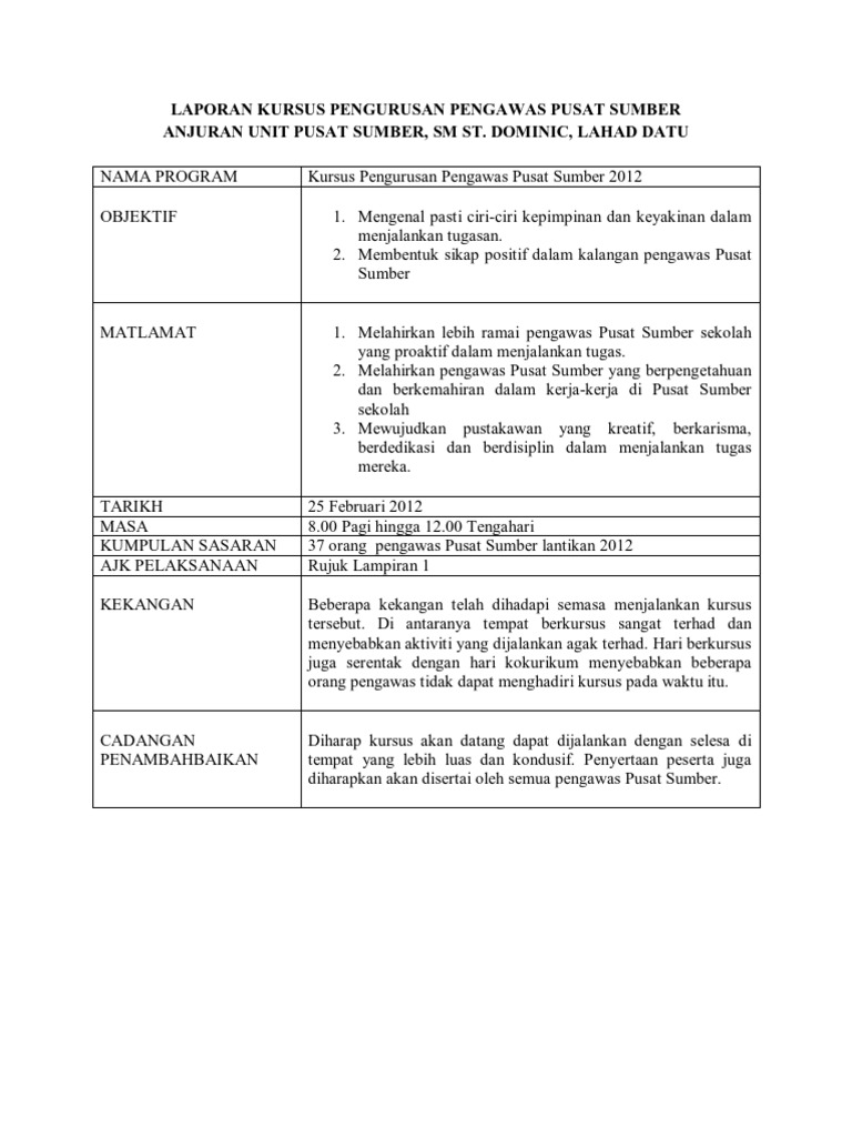 Laporan Kursus Pengurusan Pengawas Pusat Sumber Anjuran Unit Pusat Sumber Sm St Dominic Lahad Datu