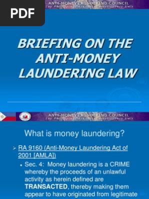 Money laundering ra 9160 anti money laundering act of 2001 amla sec. The anti money laundering council amlc is the agency of the government of the philippines that is tasked to implement the provisions of republic act no. These rules shall be known and cited as the rules and regulations implementing republic act no. The anti money laundering act of 2001 amla is the primary aml cft law in the philippines.