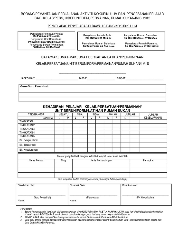Borang Pemantauan Perjalanan Aktiviti Kokurikulum Dan Pengesanan Pelajar Bagi Kelab Dan Persatuan 2012