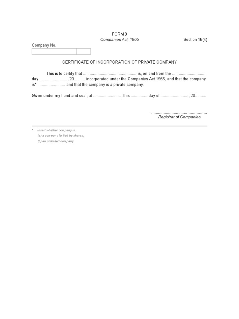 Form 9 Certificate Of Incorporation Of Private Company Companies Regulations 1966 P U Legal Concepts Copyright Law