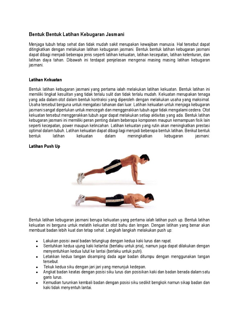 Kamu bisa sebutkan dan memilih latihan dengan intensitas rendah sedang atau tinggi. Guna meningkatkan taraf kebugaran jasmani seseorang diperlukan latihan yang berkenaan dengan kondisi fisik. Kekuatan strenght adalah kemampuan dalam mempergunakan otot untuk menerima beban sewaktu bekerja. Kebugaran jasmani adalah kemampuan tubuh untuk melakukan aktivitas sehari tanpa mengalami kelelahan yang berarti atau berlebihan sehingga tubuh masih bisa melakukan aktivitas serupa di keesokan harinya.