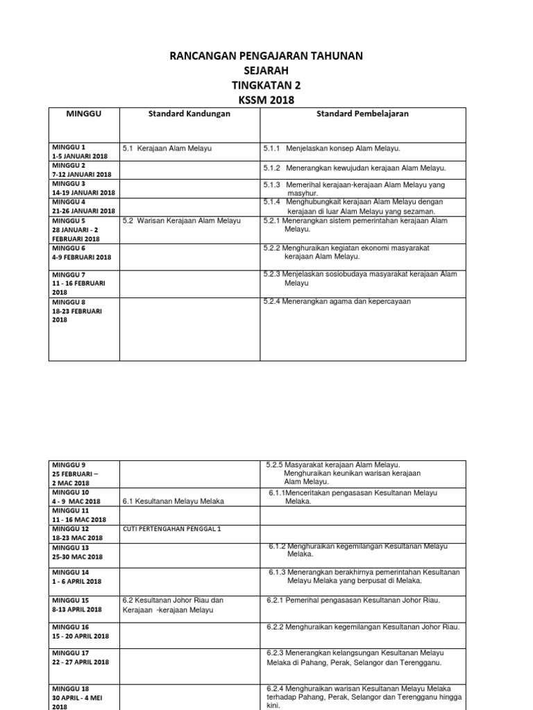 Rancangan Pelajaran Tahunan Sejarah Tingkatan 2 Tahun 2018