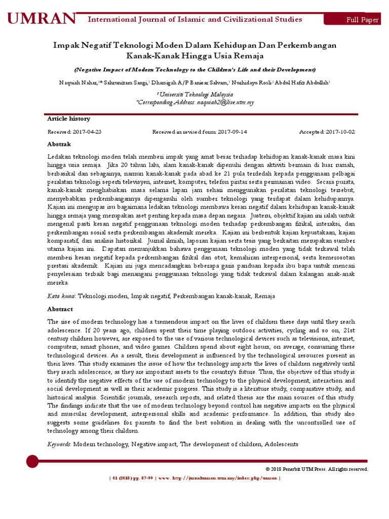 Pdf Impak Negatif Teknologi Moden Dalam Kehidupan Dan Perkembangan Kanak Kanak Hingga Usia Remaja Negative Impact Of Modern Technology To The Children S Life And Their Development