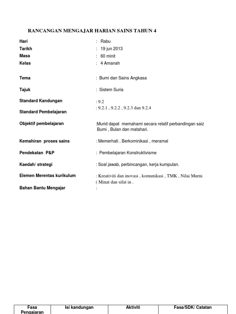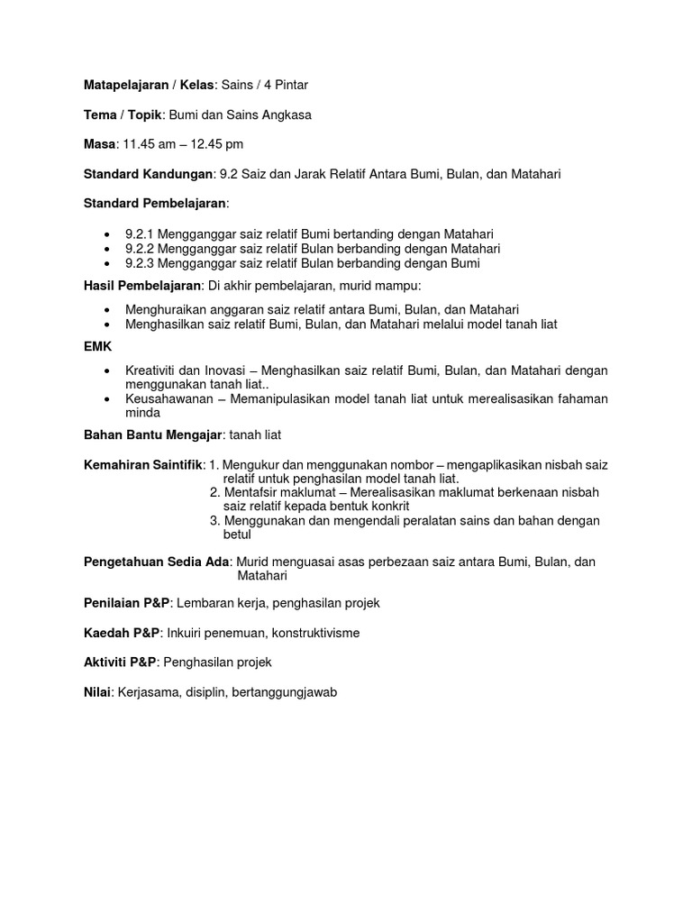 Rancangan Mengajar Harian Sains Tahun 4 Jarak Relatif
