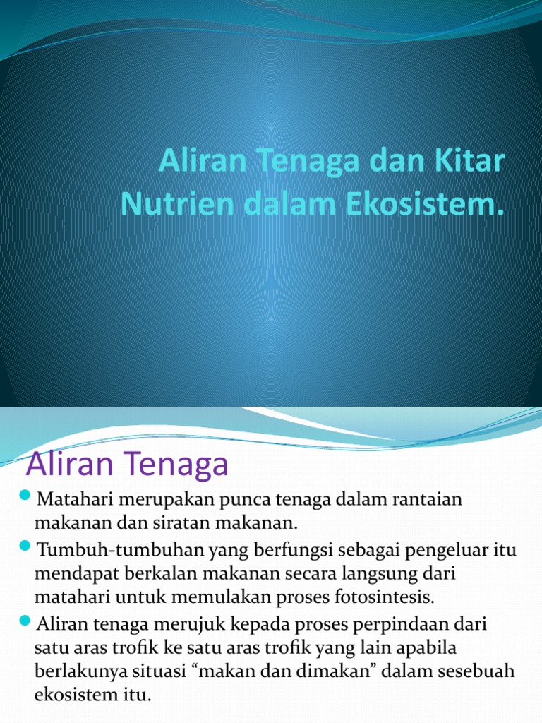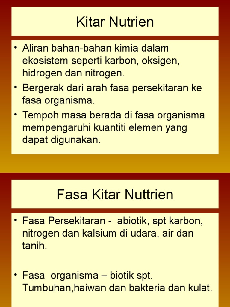 Ia berlaku secara berterusan dan berkesinambungan dalam edaran yang lengkap dan sempurna. Pemindahan nutrien dan tenaga berlaku secara berterusan dalam sesuatu ekosistem. Kitar nutrien pemindahan nutrient dan tenaga dalam ekosistem. Nutrien nutrien ini diperlukan dengan banyak.