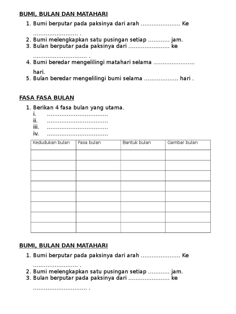 Latihan Murid Bumi Bulan Dan Matahari