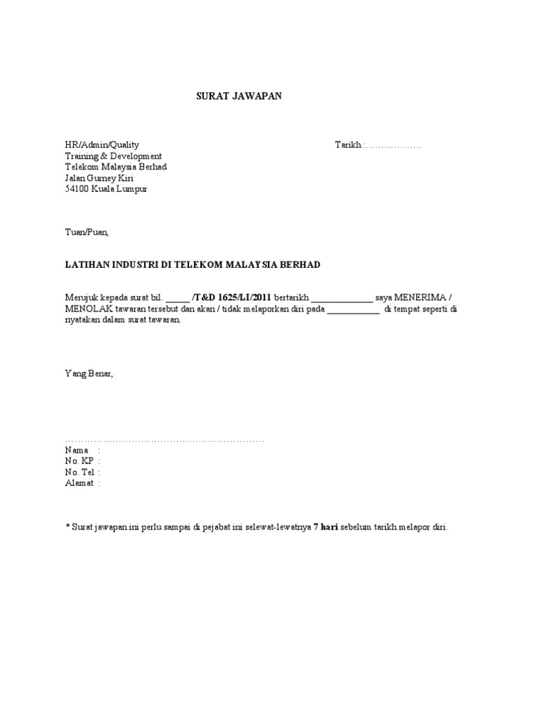 Surat Jawapan Latihan Industri Di Telekom Malaysia Berhad