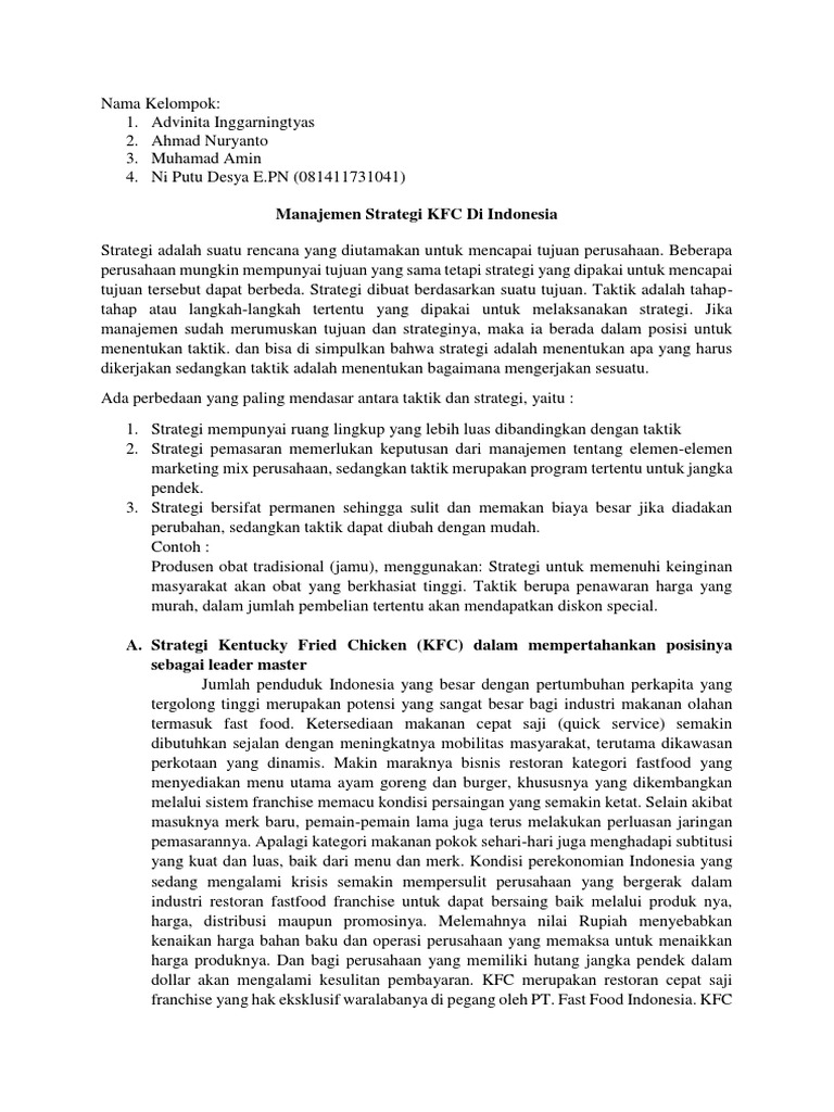 Matlamat dan strategi organisasi misi visi organisasi ingin menjadikan kafe internet qfinity ini sebagai salah sebuah kafe internet yang popular berpengaruh dan mendominasi seluruh kawasan kilang lama kulim. Mengikut musim biasanya resepi baru itu akan mula dijual pada musim tertentu seperti sempena musim perayaan. Kfc di indonesia pt fast food indonesia ayam goreng. Strategi pemasaran kfc disusun oleh.