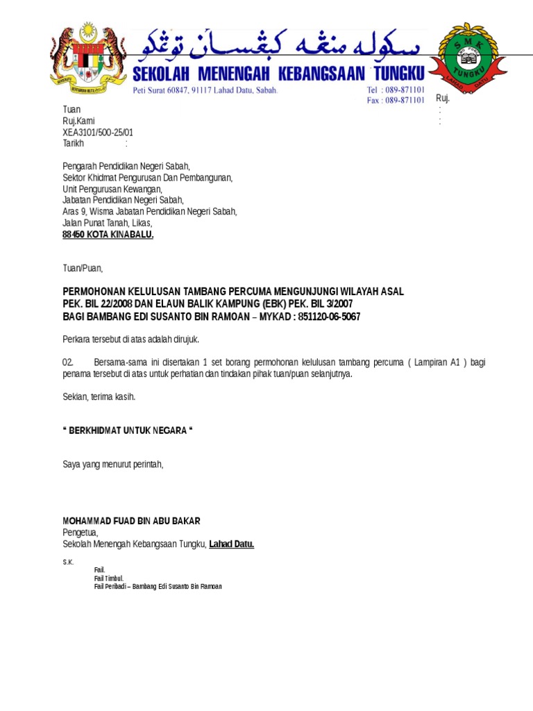 Surat Penghantar Borang Permohonan Tambang Percuma Mengunjungi Wilayah Asal Di Bawah Pekeliling Perkhidmatan Bil 22 Tahun 2008 Lampiran A1