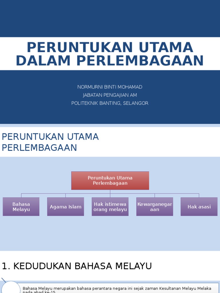 Peruntukan utama dalam perlembagaan malaysia. Peruntukan ini termaktub dalam perkara 152 perlembagaan persekutuan malaysia peruntukan ini tidak meghalang penggunaan pengajaran dan pembelajaran bahasa etnik lain ataupun bahasa asing 2. Perlembagaan malaysia merupakan undang undang tertinggi negara. Peruntukan utama perlembagaan malaysia 1. Eliyana natasha bt azman fatin haziqah bt rosli nurhidayatun najiha bt batwaruddin najihah wahdaniah bt ishak pengajian malaysia dgu 1a 2.