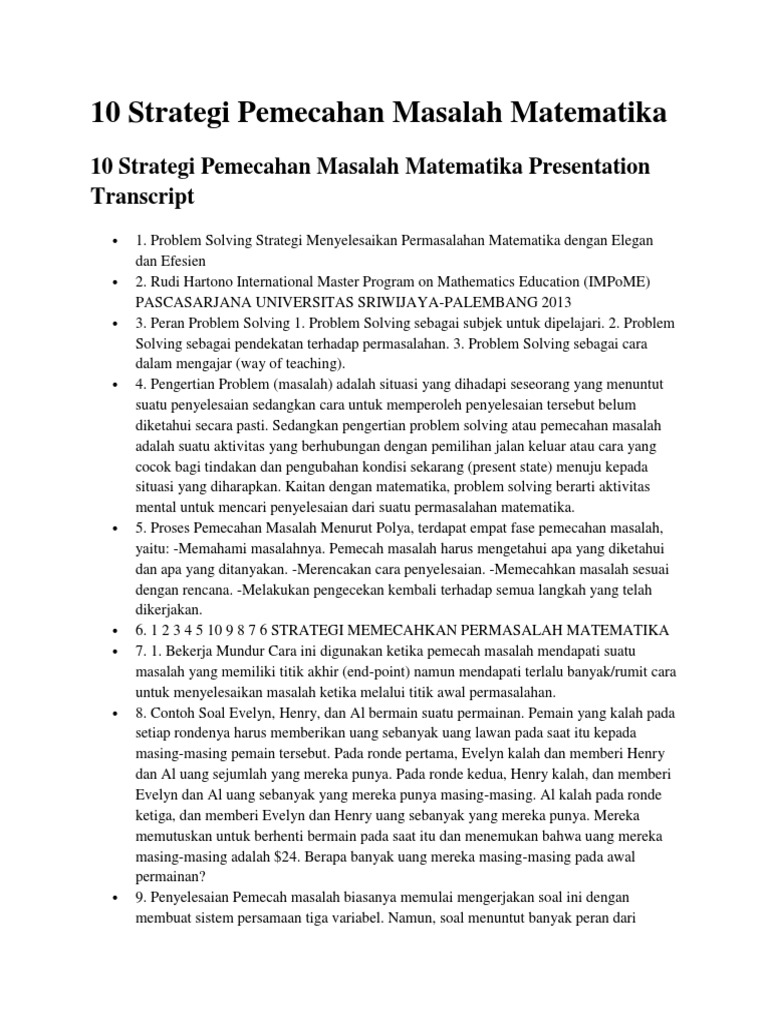 Pdf Sepuluh Strategi Dalam Pemecahan Masalah Matematika